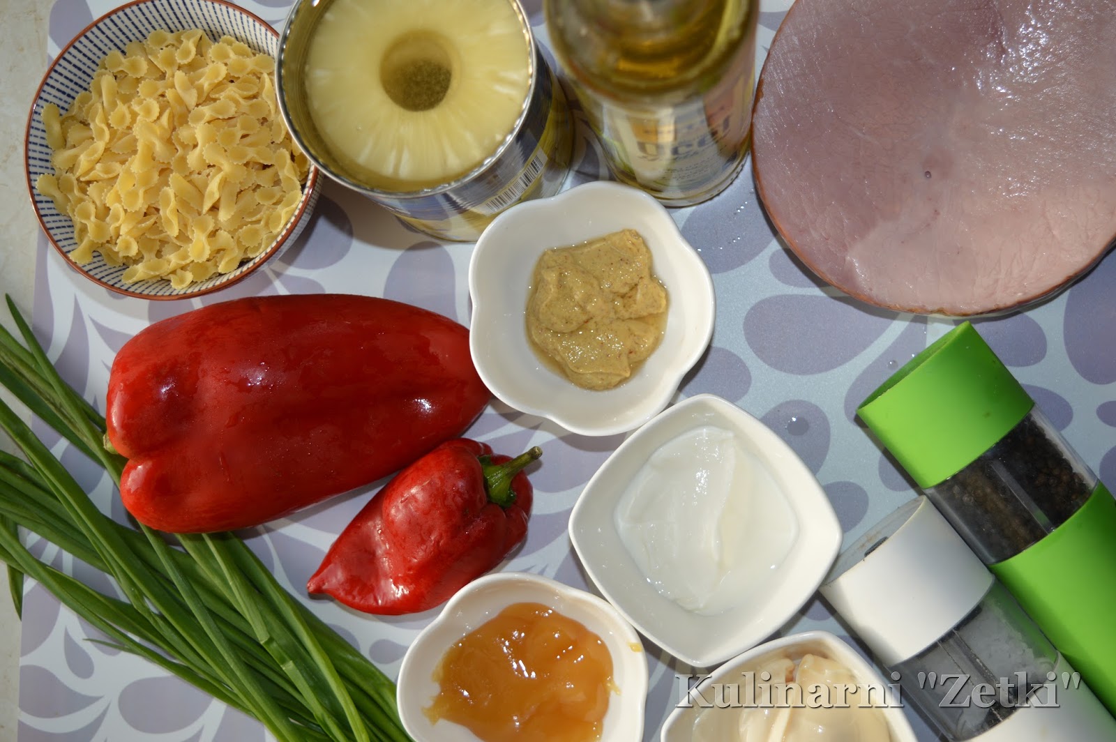 Makaron ugotować wg instrukcji na opakowaniu, odcedzić na sitku, osuszyć. Ananasa odsączyć z syropu, pokroić w kostkę. Szynkę pokroić w kostkę. Szczypiorek posiekać. Papryki umyć, osuszyć, pozbawić gniazd nasiennych, a następnie pokroić w kostkę.