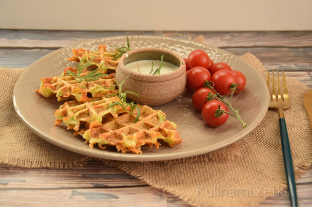 Gofry podawać z sosem i pomidorkami i ziołami.