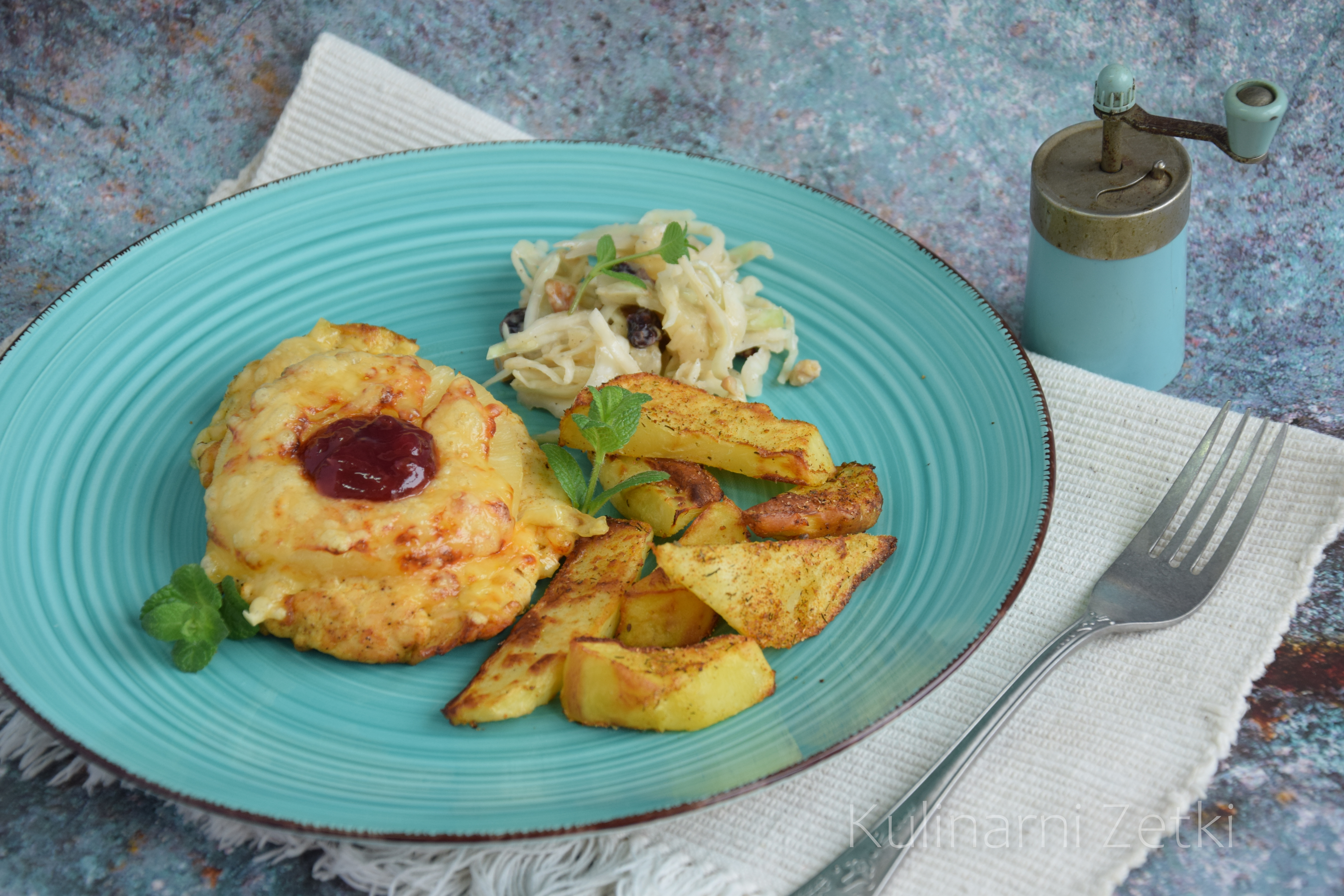 Po usmażeniu przełożyć kotlety po hawajsku na talerz, a dziurkę od ananasa wypełnić łyżeczką żurawiny ze słoiczka.